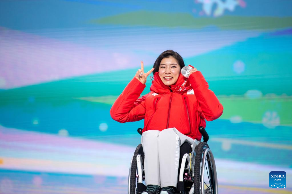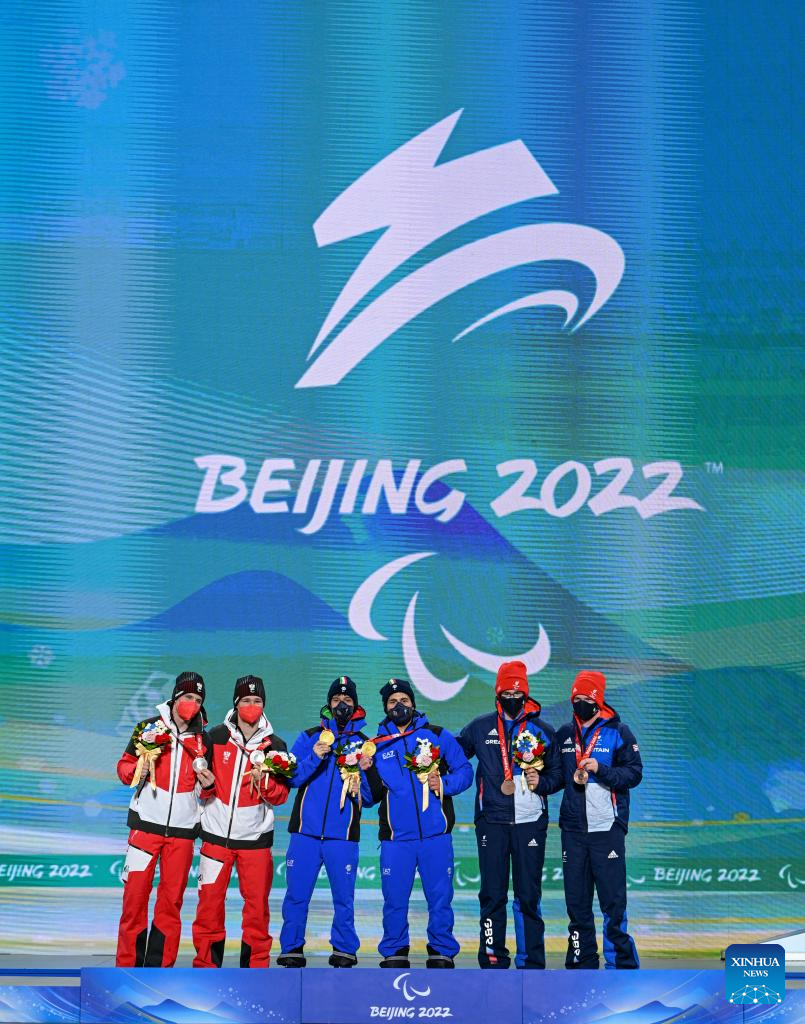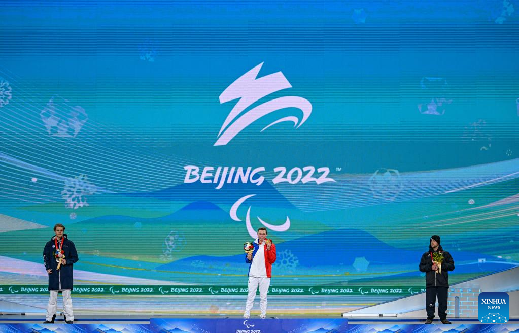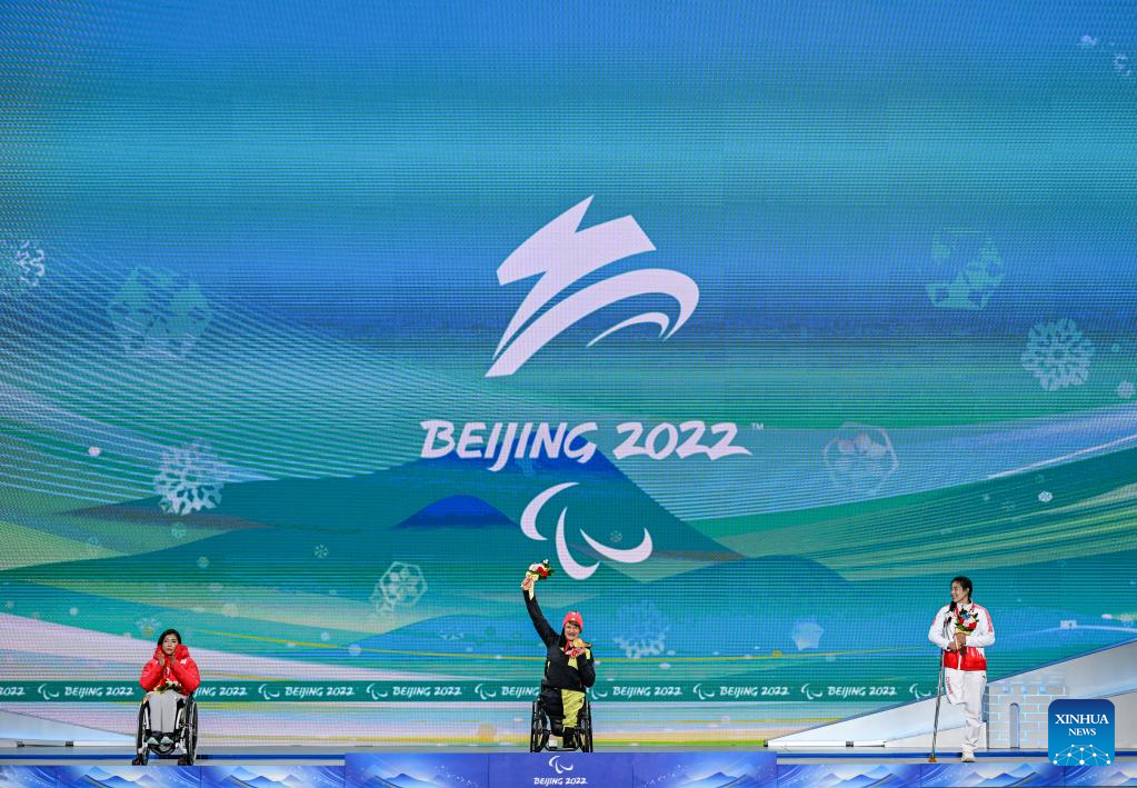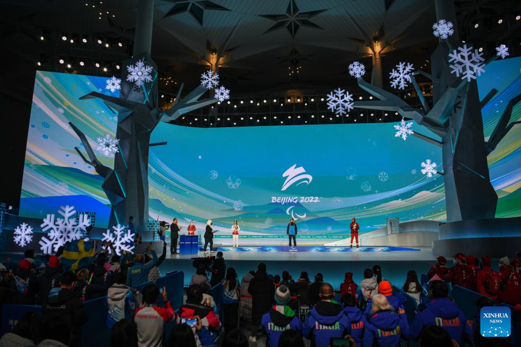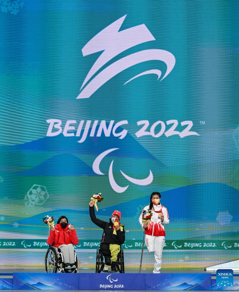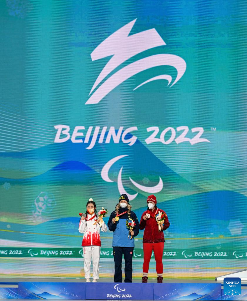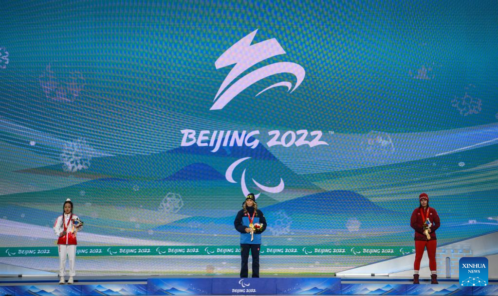Photo taken on March 8, 2022 shows the awarding ceremony for the Alpine Skiing Women's Super Combined Standing of Beijing 2022 Paralympic Winter Games at Yanqing Medals Plaza of the Winter Paralympics in Yanqing District, Beijing, capital of China. (Xinhua/Sun Fei)