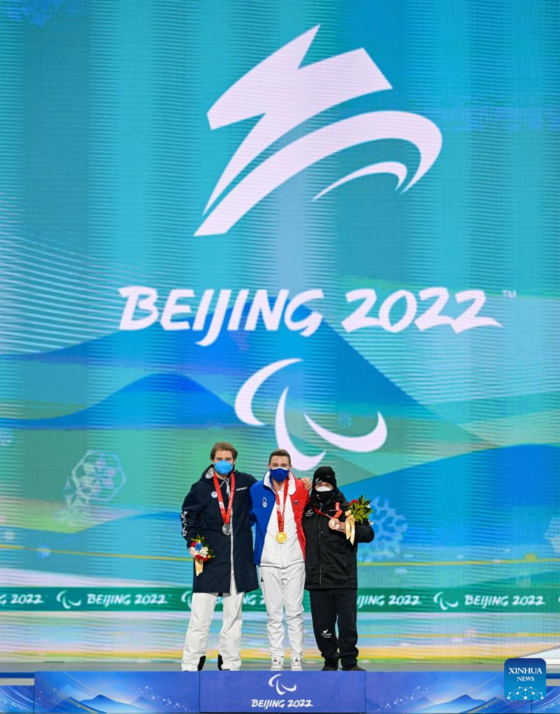 Gold medalist Arthur Bauchet (C) of France, silver medalist Santeri Kiiveri (L) of Finland and bronze medalist Adam Hall of New Zealand pose for photos during the awarding ceremony for the Alpine Skiing Men's Super Combined Standing of Beijing 2022 Paralympic Winter Games at Yanqing Medals Plaza of the Winter Paralympics in Yanqing District, Beijing, capital of China, March 8, 2022. (Xinhua/Sun Fei)