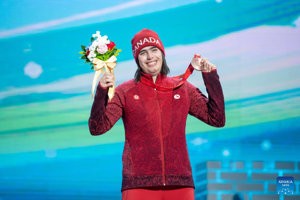 Bronze medalist Alana Ramsay of Canada poses for photos during the awarding ceremony for the Alpine Skiing Women's Super Combined Standing of Beijing 2022 Paralympic Winter Games at Yanqing Medals Plaza of the Winter Paralympics in Yanqing District, Beijing, capital of China, March 8, 2022. (Xinhua/Jiang Han)