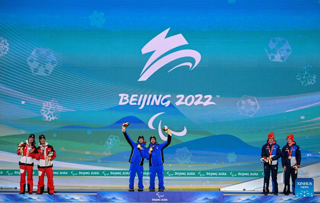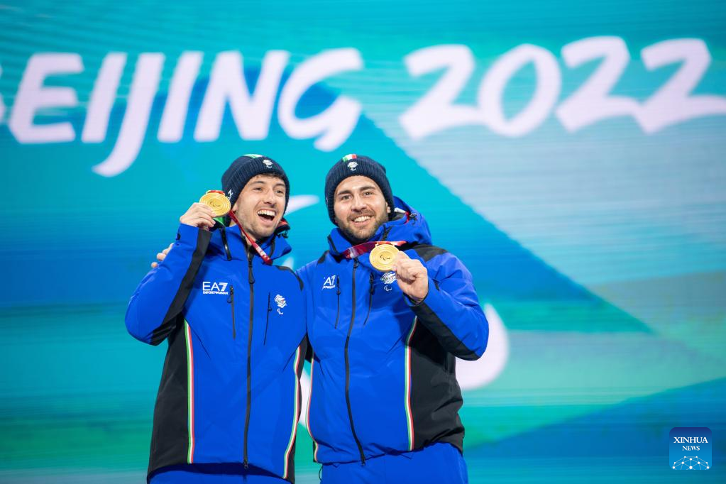 Gold medalist Giacomo Bertagnolli (L) and his guide Andrea Ravelli of Italy pose for photos during the awarding ceremony for the Alpine Skiing Men's Super Combined Vision Impaired of Beijing 2022 Paralympic Winter Games at Yanqing Medals Plaza of the Winter Paralympics in Yanqing District, Beijing, capital of China, March 8, 2022. (Xinhua/Jiang Han)
