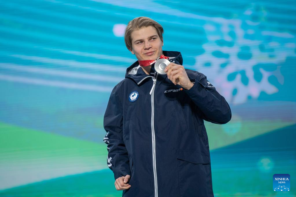 Silver medalist Santeri Kiiveri of Finland poses for photos during the awarding ceremony for the Alpine Skiing Men's Super Combined Standing of Beijing 2022 Paralympic Winter Games at Yanqing Medals Plaza of the Winter Paralympics in Yanqing District, Beijing, capital of China, March 8, 2022. (Xinhua/Jiang Han)