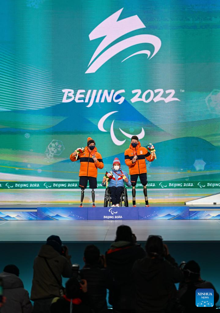 Gold medalist Jesper Pedersen (C) of Norway, silver medalist Jeroen Kampschreur (L) of the Netherlands and bronze medalist Niels de Langen of the Netherlands pose for photos during the awarding ceremony for the Alpine Skiing Men's Super Combined Sitting of Beijing 2022 Paralympic Winter Games at Yanqing Medals Plaza of the Winter Paralympics in Yanqing District, Beijing, capital of China, March 8, 2022. (Xinhua/Sun Fei)