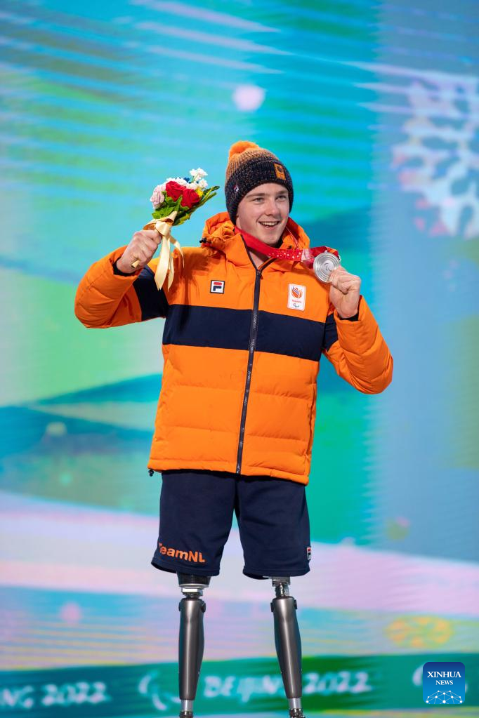 Silver medalist Jeroen Kampschreur of the Netherlands poses for photos during the awarding ceremony for the Alpine Skiing Men's Super Combined Sitting of Beijing 2022 Paralympic Winter Games at Yanqing Medals Plaza of the Winter Paralympics in Yanqing District, Beijing, capital of China, March 8, 2022. (Xinhua/Jiang Han)