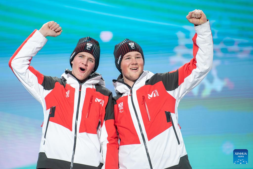 Silver medalist Johannes Aigner (L) and his guide Matteo Fleischmann of Austria pose for photos during the awarding ceremony for the Alpine Skiing Men's Super Combined Vision Impaired of Beijing 2022 Paralympic Winter Games at Yanqing Medals Plaza of the Winter Paralympics in Yanqing District, Beijing, capital of China, March 8, 2022. (Xinhua/Jiang Han)
