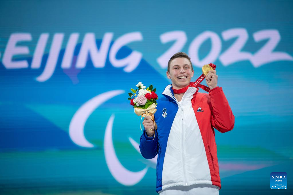 Gold medalist Arthur Bauchet of France poses for photos during the awarding ceremony for the Alpine Skiing Men's Super Combined Standing of Beijing 2022 Paralympic Winter Games at Yanqing Medals Plaza of the Winter Paralympics in Yanqing District, Beijing, capital of China, March 8, 2022. (Xinhua/Jiang Han)