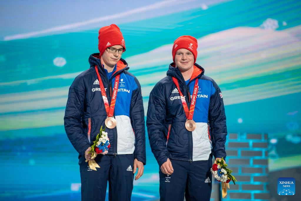 Bronze medalist Neil Simpson (L) and his guide Andrew Simpson of Great Britain pose for photos during the awarding ceremony for the Alpine Skiing Men's Super Combined Vision Impaired of Beijing 2022 Paralympic Winter Games at Yanqing Medals Plaza of the Winter Paralympics in Yanqing District, Beijing, capital of China, March 8, 2022. (Xinhua/Jiang Han)