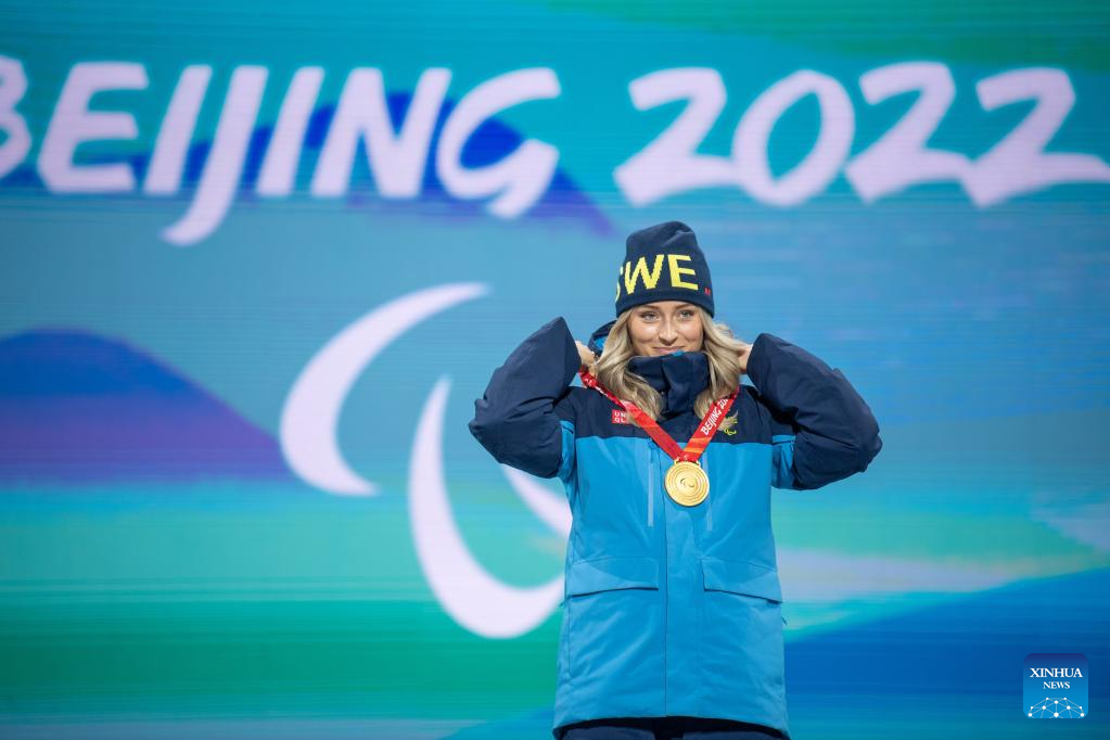 Gold medalist Ebba Aarsjoe of Sweden poses for photos during the awarding ceremony for the Alpine Skiing Women's Super Combined Standing of Beijing 2022 Paralympic Winter Games at Yanqing Medals Plaza of the Winter Paralympics in Yanqing District, Beijing, capital of China, March 8, 2022. (Xinhua/Jiang Han)