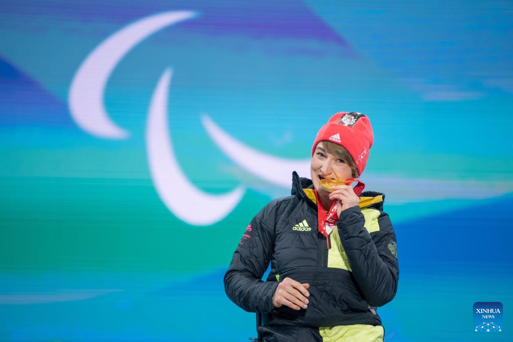 Gold medalist Anna-Lena Forster of Germany poses for photos during the awarding ceremony for the Alpine Skiing Women's Super Combined Sitting of Beijing 2022 Paralympic Winter Games at Yanqing Medals Plaza of the Winter Paralympics in Yanqing District, Beijing, capital of China, March 8, 2022. (Xinhua/Jiang Han)