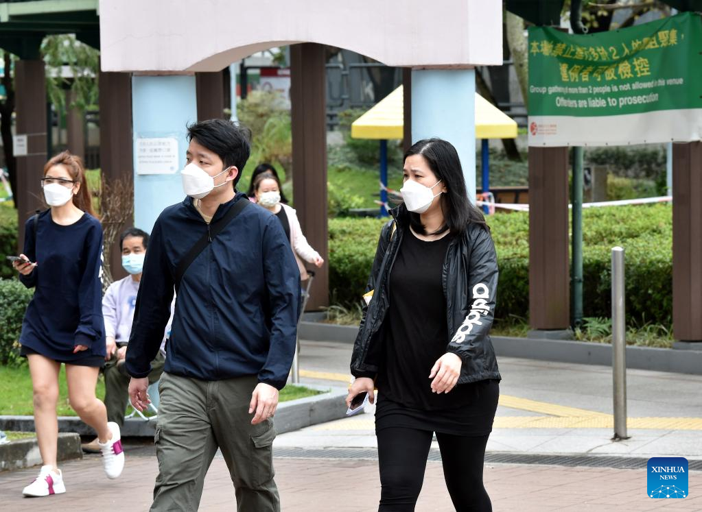 Citizens wearing face masks walk on a street in Ma On Shan in Hong Kong, south China, March 7, 2022. (Xinhua/Lo Ping Fai)