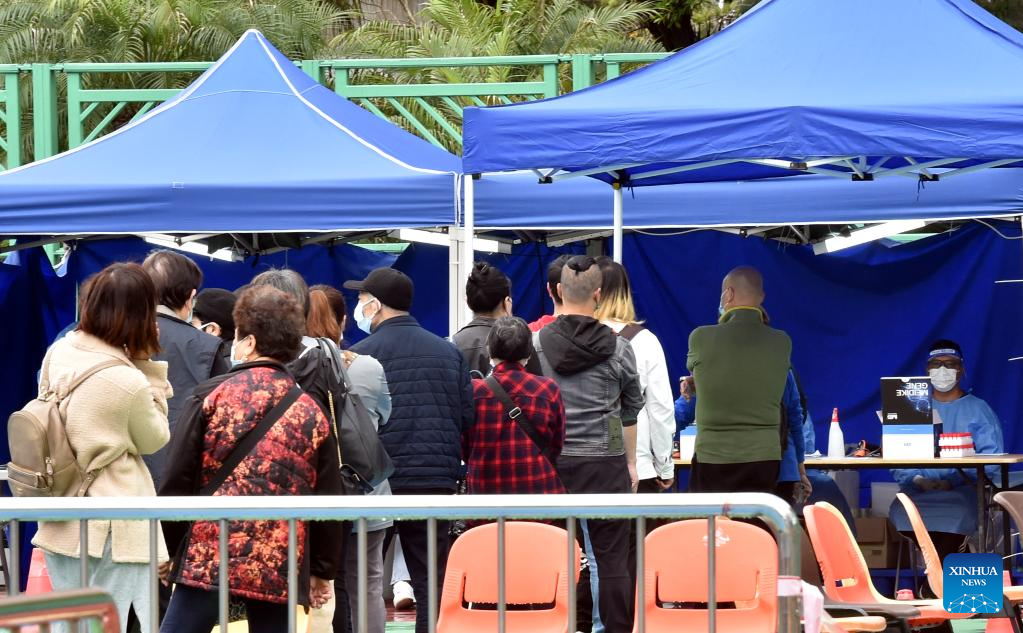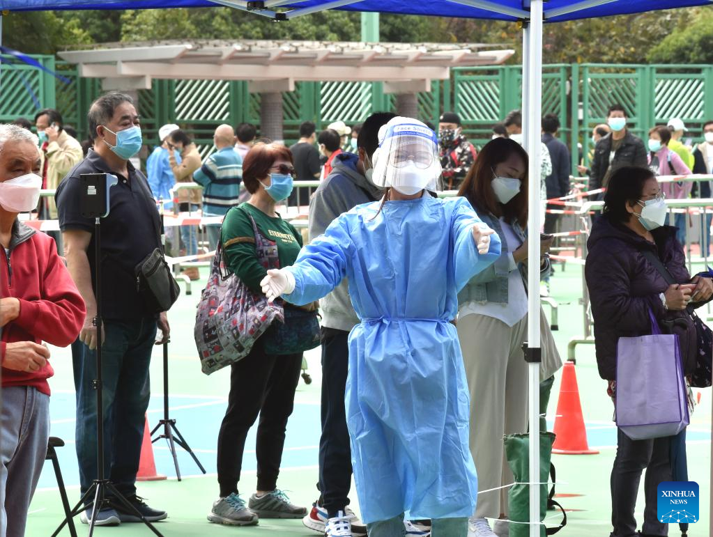 Citizens line up to conduct nucleic acid testing for COVID-19 at a mobile testing site in Ma On Shan in Hong Kong, south China, March 7, 2022. (Xinhua/Lo Ping Fai)