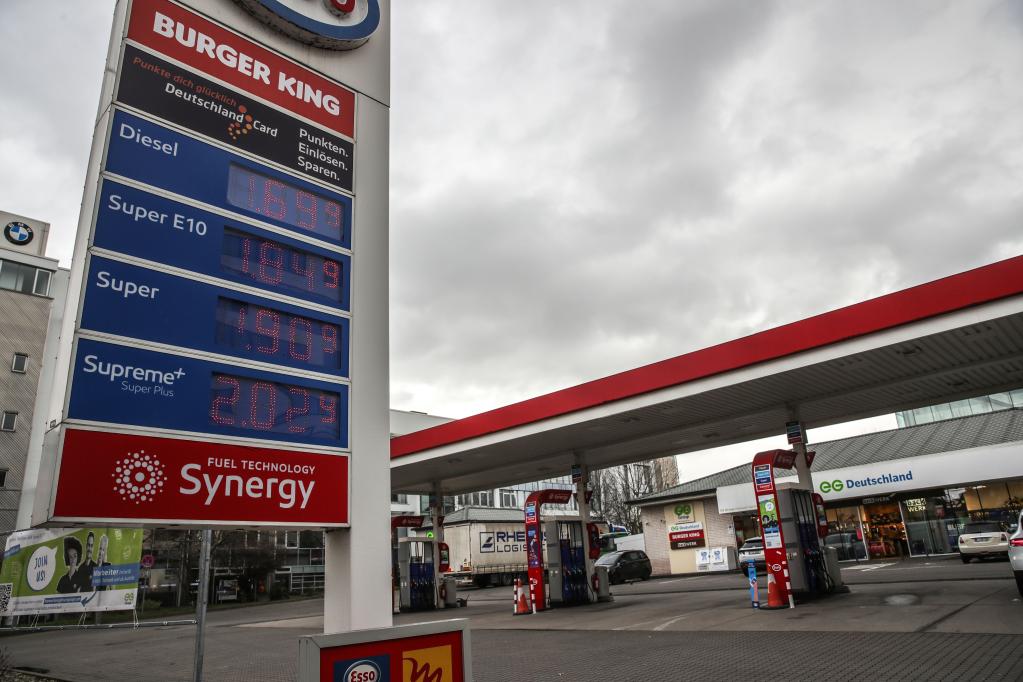 Photo taken on Feb. 25, 2022 shows diesel and gasoline prices displayed on a screen at a gas station in Frankfurt, Germany. (Photo by Armando Babani/Xinhua)
