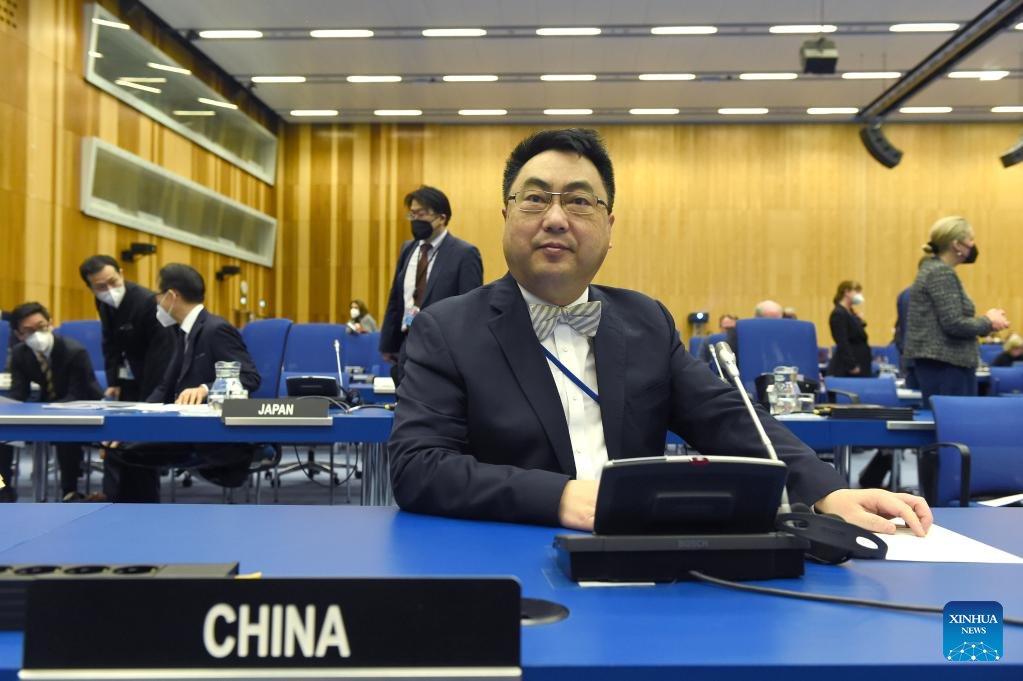 China's Permanent Representative to the United Nations in Vienna Wang Qun attends a meeting of the International Atomic Energy Agency (IAEA) Board of Governors in Vienna, Austria, March 7, 2022. Wang Qun said on Monday that the issue of the legitimacy of the nuclear weapon material transfer involved in AUKUS must not be dodged. Wang made the remarks after a meeting of the IAEA Board of Governors decided by consensus to set up a formal agenda item on "Transfer of nuclear materials in the context of AUKUS and its safeguards in all aspects under the NPT (Treaty on the Non-Proliferation of Nuclear Weapons) at China's proposal. (Xinhua/Guo Chen)