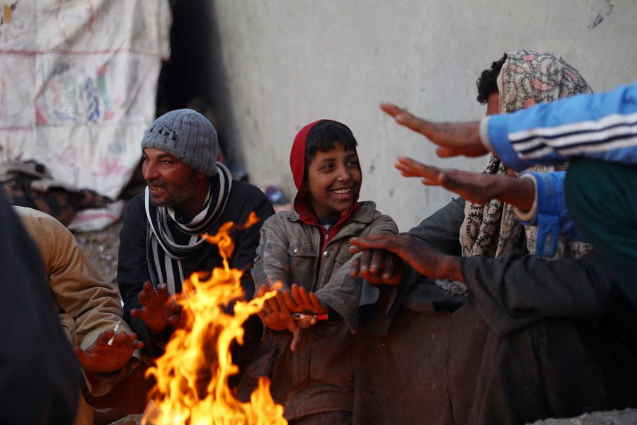 Egyptians warm themselves by a wood fire during cold weather in Cairo, Egypt, on Jan. 26, 2022. (Xinhua/Ahmed Gomaa)