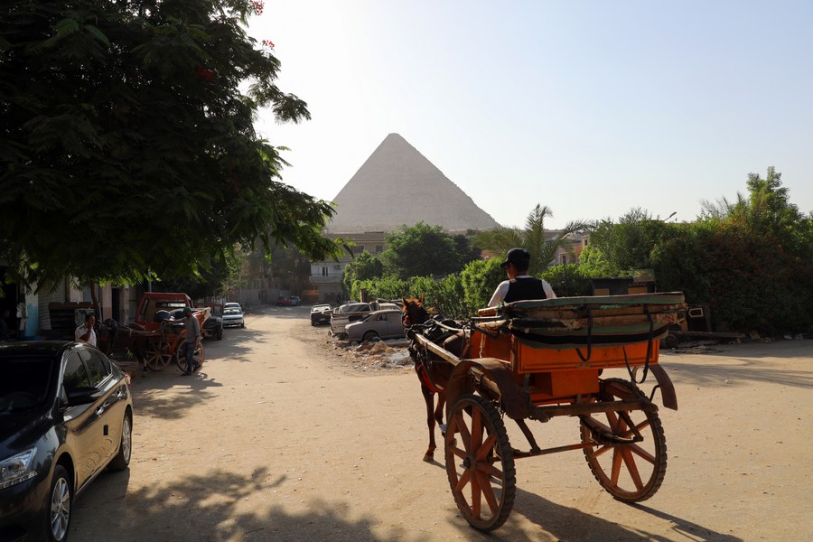 A carriage runs on a road in a residential area outside of the Great Pyramid of Giza, Egypt, on Sept. 19, 2021. (Xinhua/Sui Xiankai)