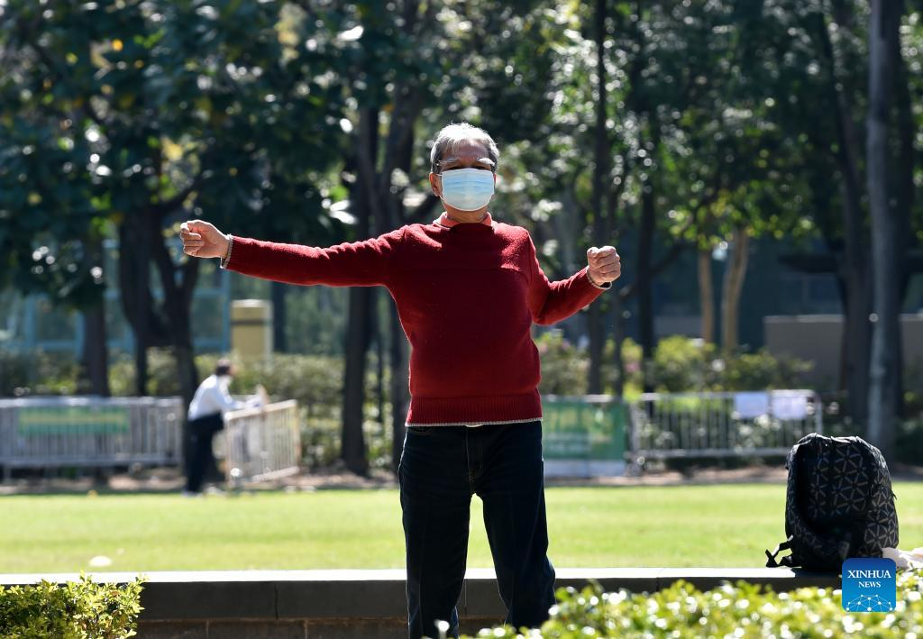 A man wearing a face mask works out at Victoria Park in Hong Kong, south China, March 8, 2022. The Hong Kong Special Administrative Region (HKSAR) reported 28,475 new COVID-19 cases on March 8. (Xinhua/Lo Ping Fai)