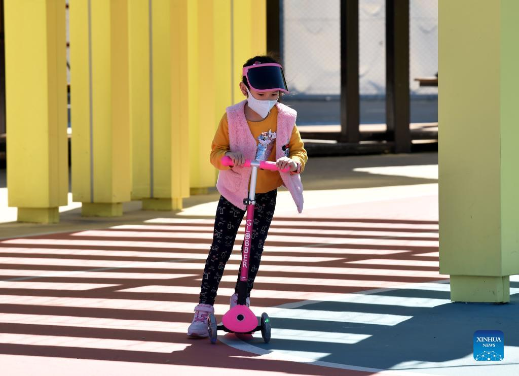 A girl wearing a face mask plays at a park in Hong Kong, south China, March 8, 2022. The Hong Kong Special Administrative Region (HKSAR) reported 28,475 new COVID-19 cases on March 8. (Xinhua/Lo Ping Fai)