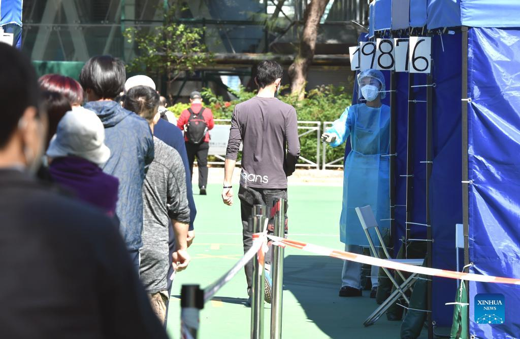 People wearing face masks line up for nucleic acid testing for COVID-19 at a mobile testing site at Victoria Park in Hong Kong, south China, March 8, 2022. The Hong Kong Special Administrative Region (HKSAR) reported 28,475 new COVID-19 cases on March 8. (Xinhua/Lo Ping Fai)