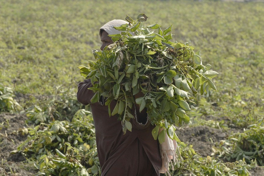A woman works in a field on the outskirts of Pakpattan, in Pakistan's Punjab province, on March 4, 2022. (Xinhua/Ahmad Kamal)