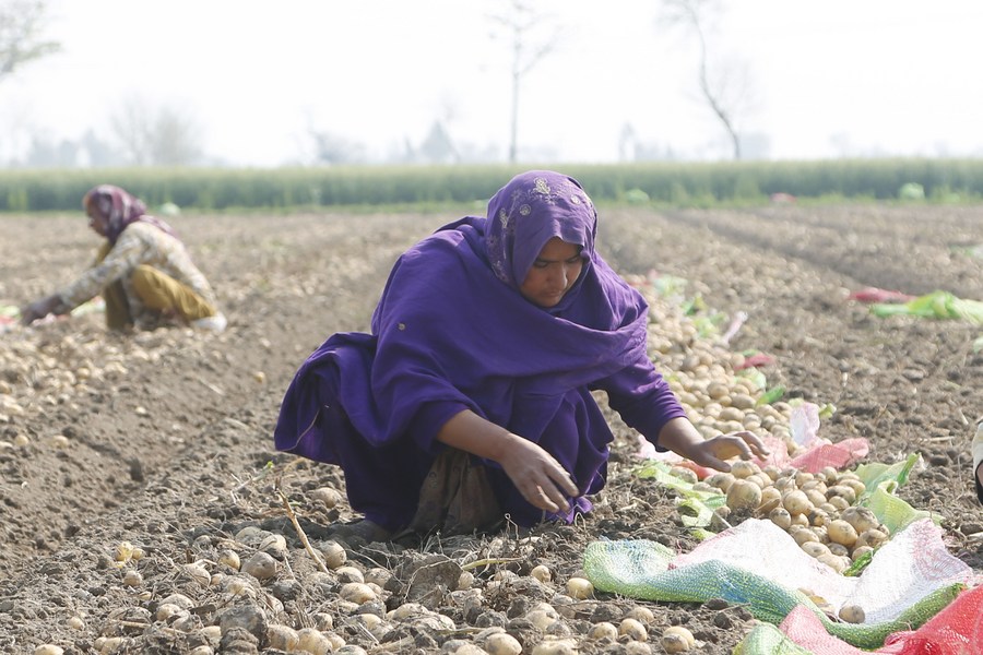 Women work in a field on the outskirts of Pakpattan, in Pakistan's Punjab province, on March 4, 2022. (Xinhua/Ahmad Kamal)
