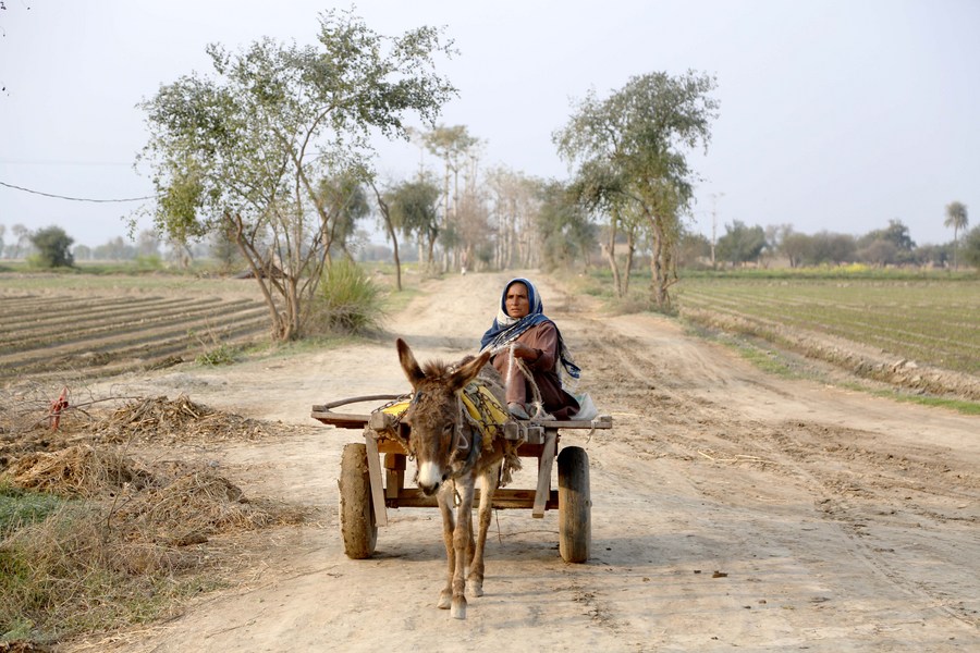 A woman rides on a donkey-cart on the outskirts of Pakpattan, in Pakistan's Punjab province, on March 4, 2022. (Xinhua/Ahmad Kamal)