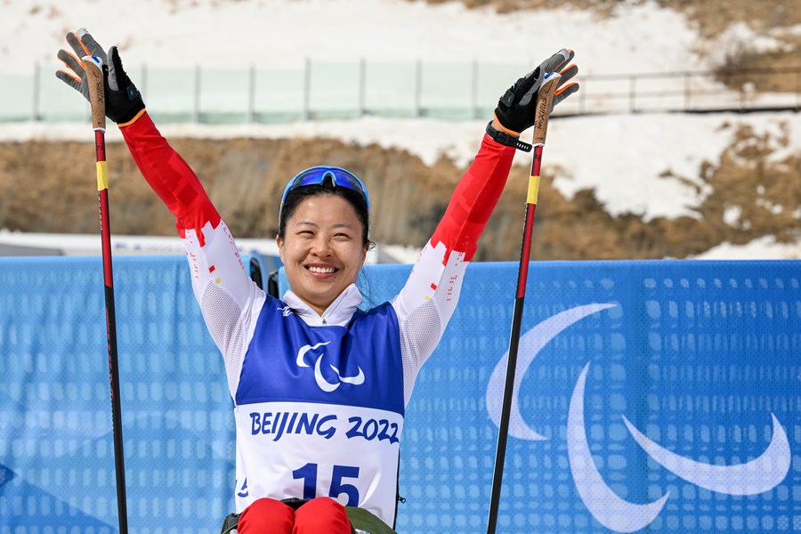 Yang Hongqiong of China celebrates after the Para cross-country skiing women's sprint sitting final of Beijing 2022 Winter Paralympics at National Biathlon Center in Zhangjiakou, north China's Hebei Province, March 9, 2022. (Xinhua/Li Bo)