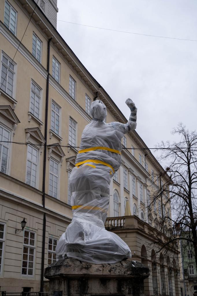 On all four corners of Lviv's Rynok Square -- one of the city's most prominent attractions in the heart of the Old Town -- the four 18th-century stone statues of ancient Greek deities have been wrapped up in protective plastic and secured with tape.