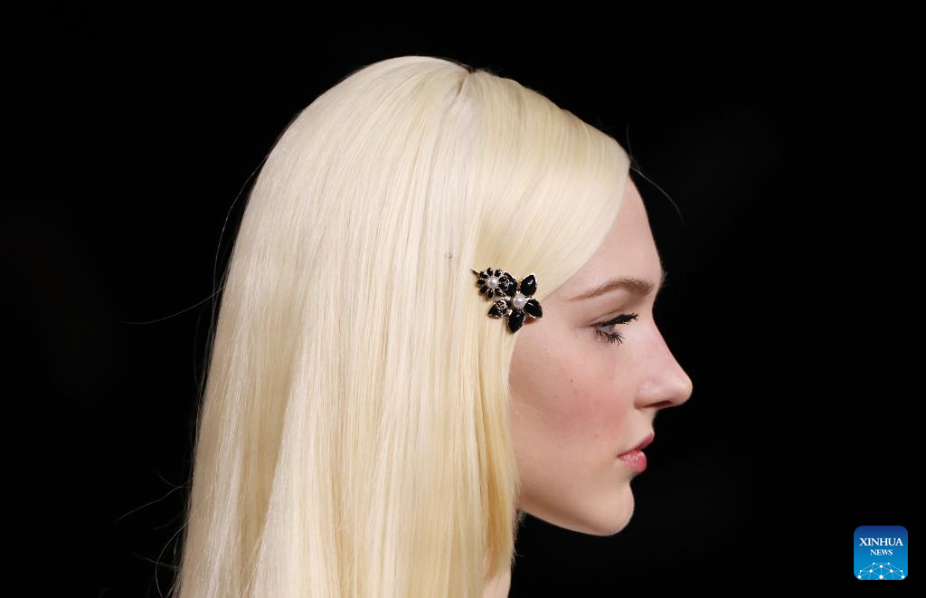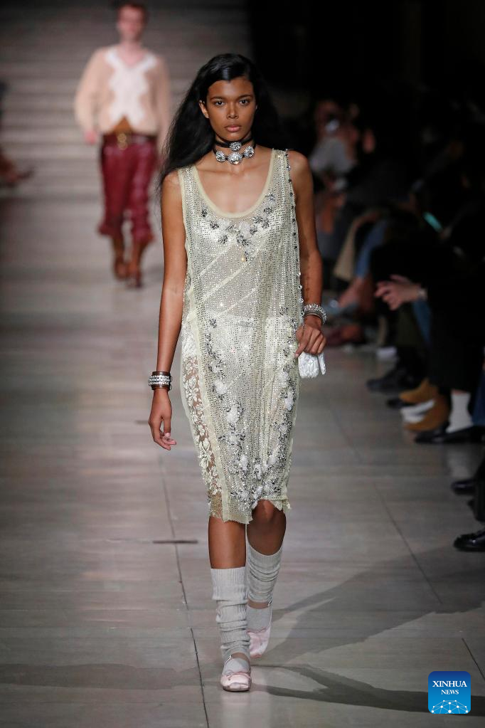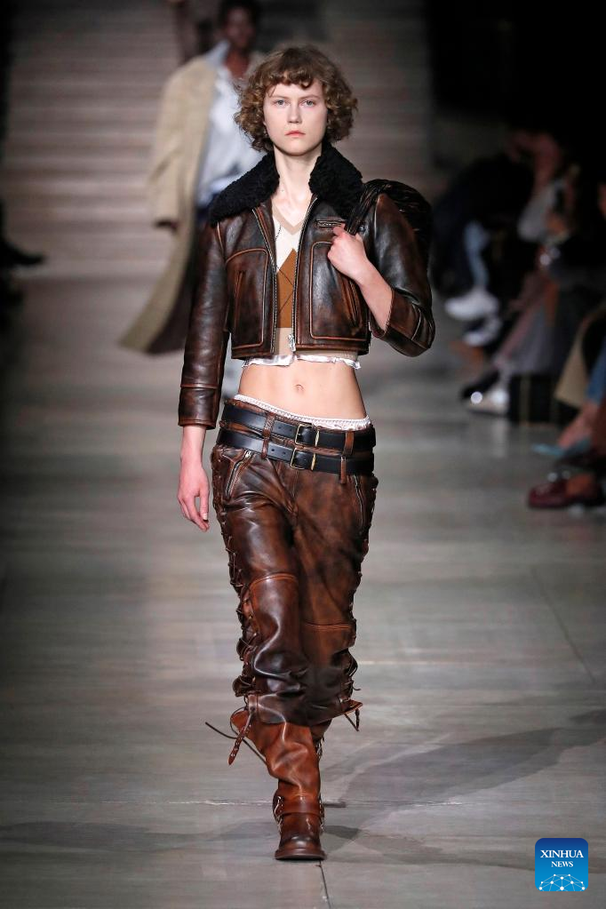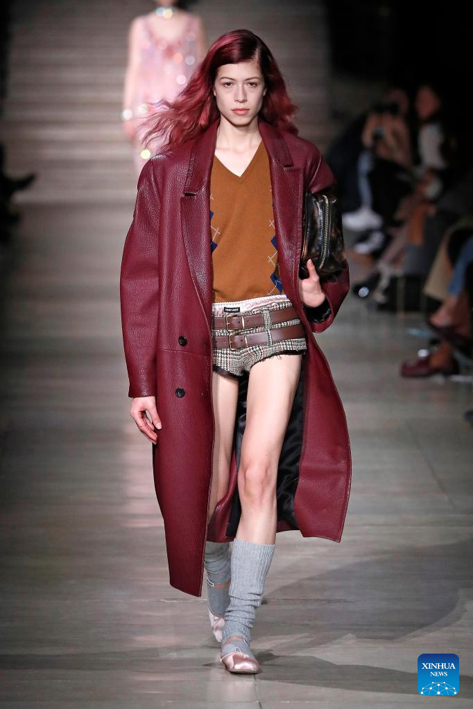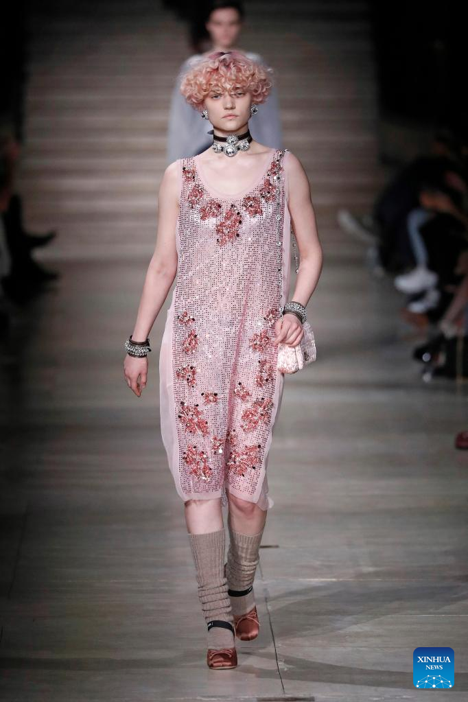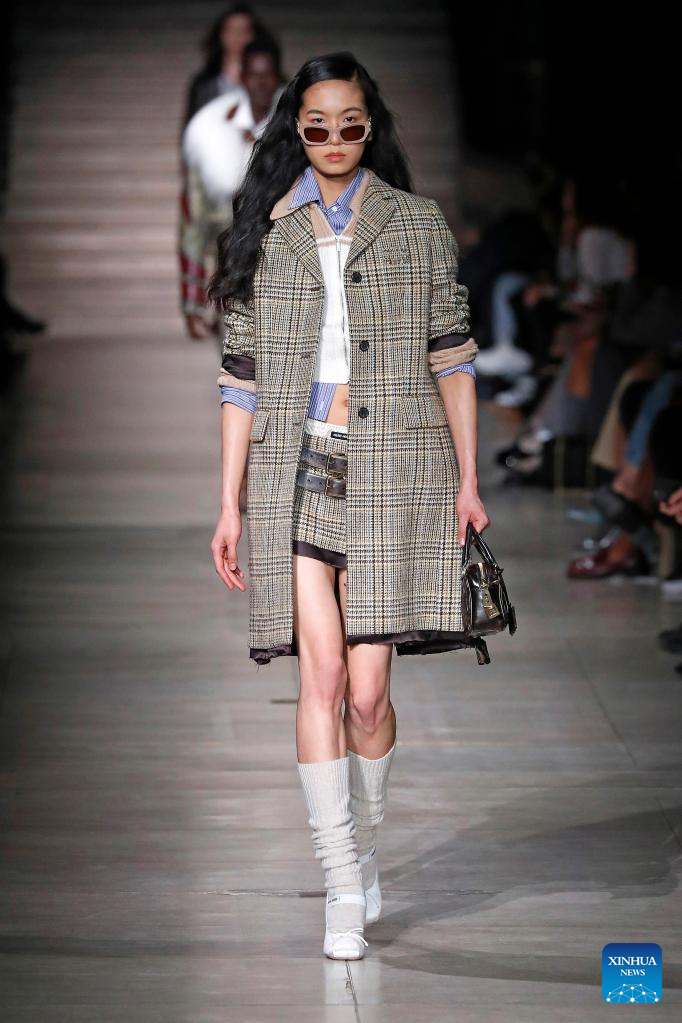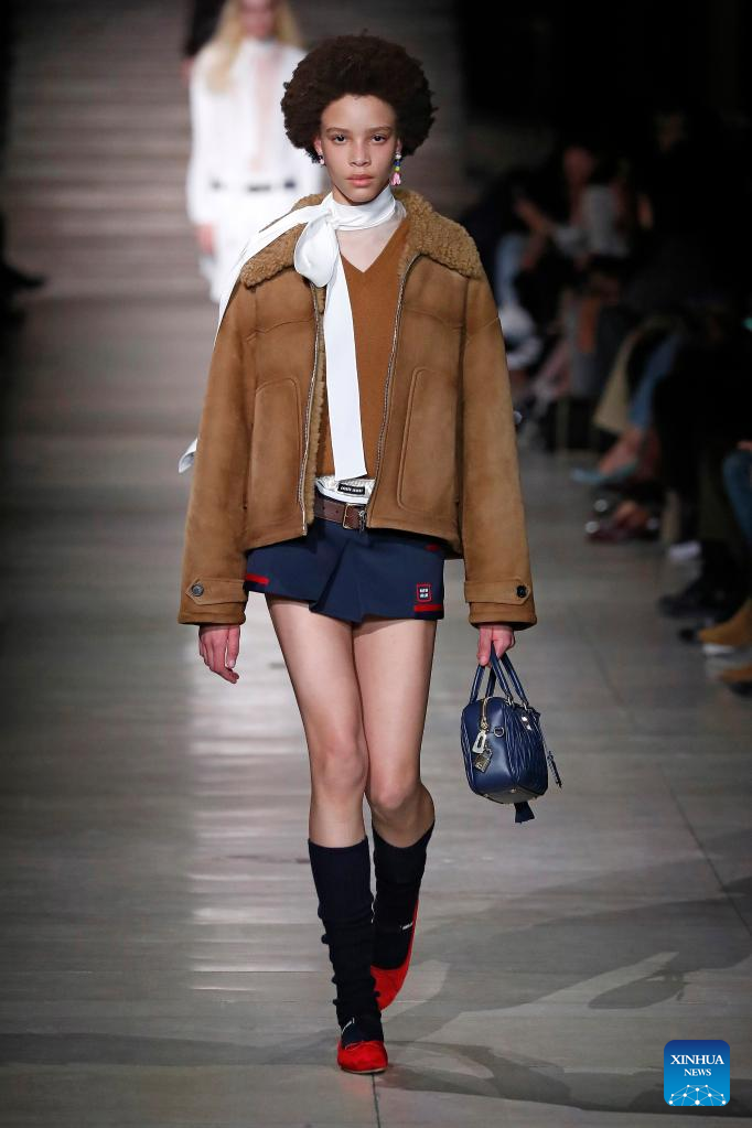A model presents a creation of Miu Miu's Fall/Winter 2022 ready-to-wear collections during Paris Fashion Week in Paris, France, on March 8, 2022. (Photo by Piero Biasion/Xinhua)