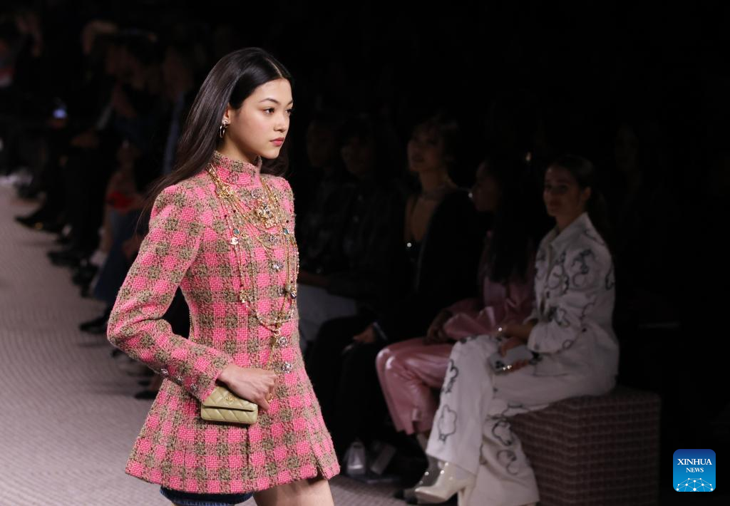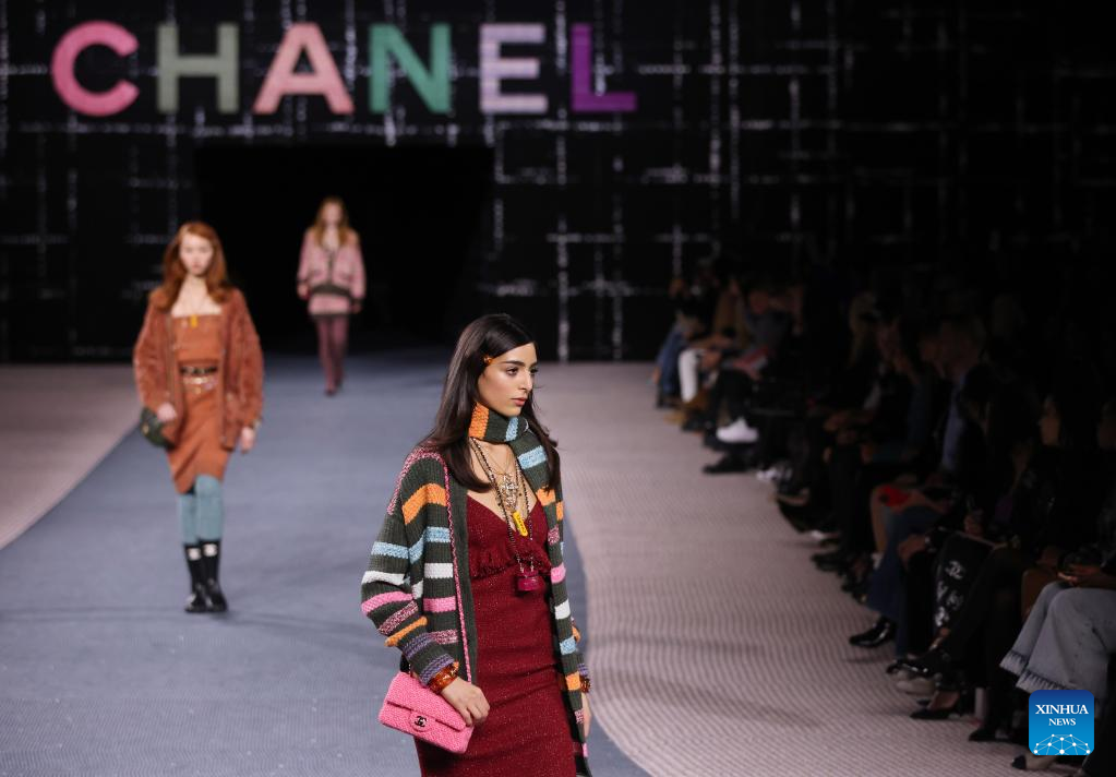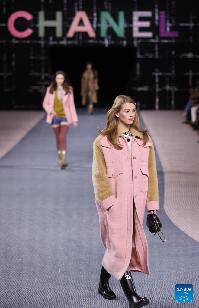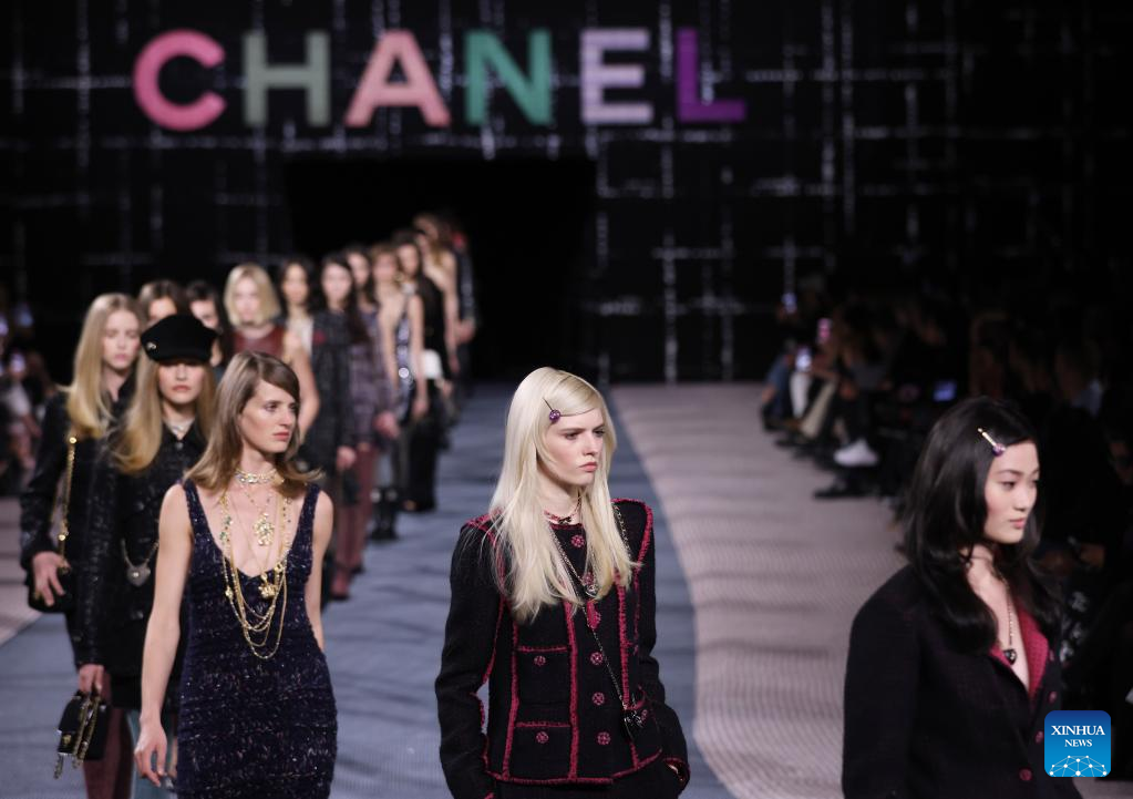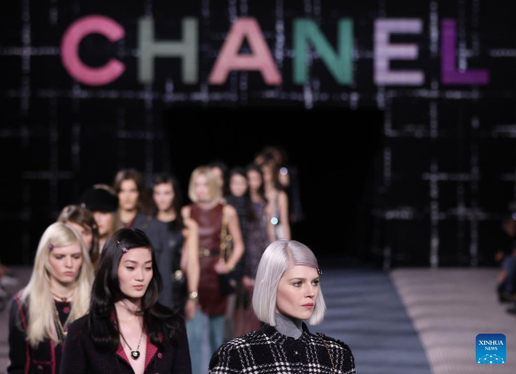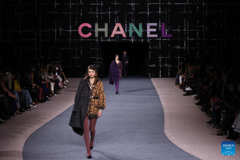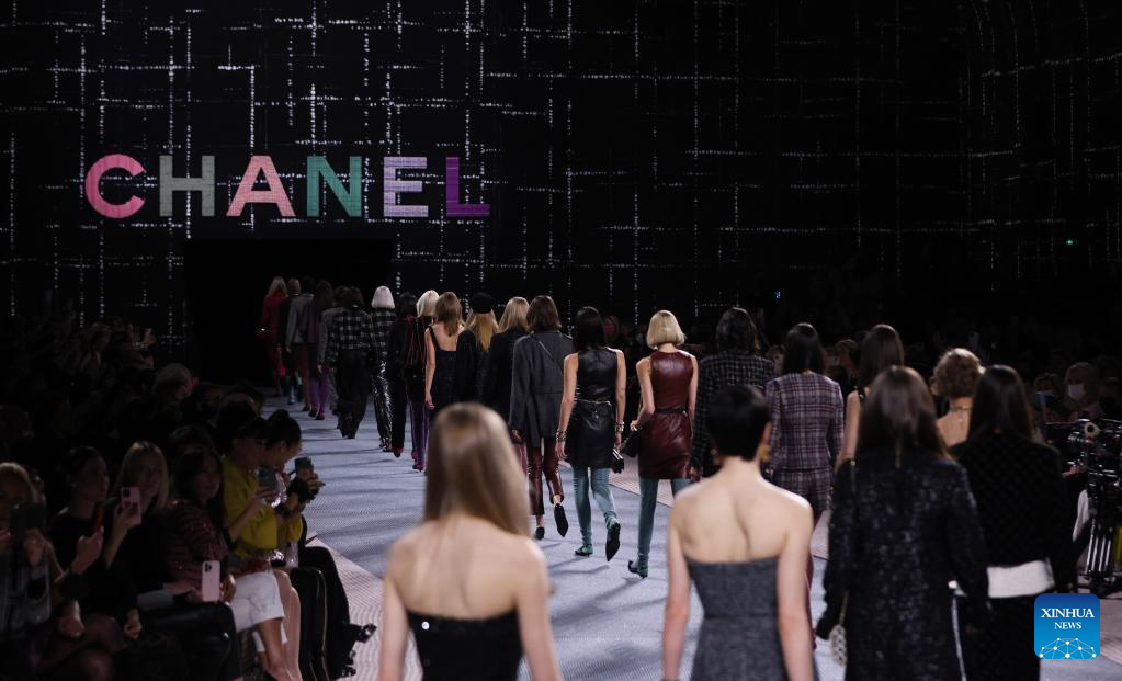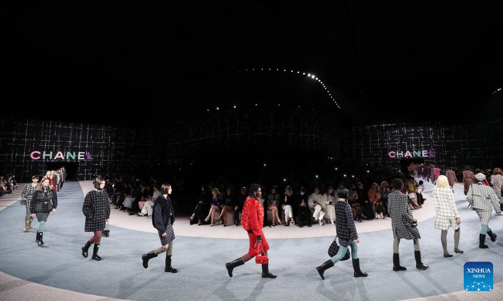 Models present creations of French fashion house Chanel's Fall/Winter 2022 ready-to-wear collections during Paris Fashion Week in Paris, France, on March 8, 2022. (Xinhua/Gao Jing)