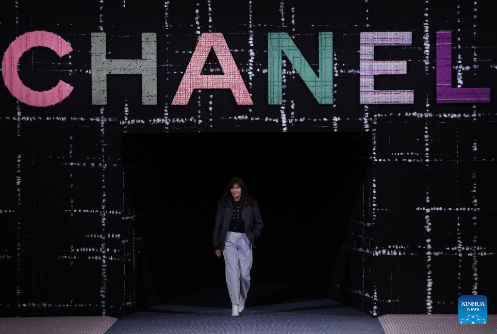 French fashion designer Virginie Viard acknowledges the audience after the French fashion house Chanel's Fall/Winter 2022 ready-to-wear collections during Paris Fashion Week in Paris, France, on March 8, 2022. (Xinhua/Gao Jing)