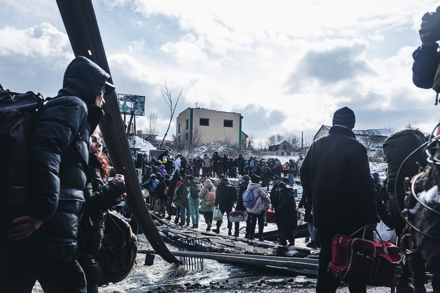 People are seen during their evacuation in Irpin, Ukraine, March 8, 2022. (Photo by Diego Herrera/Xinhua)