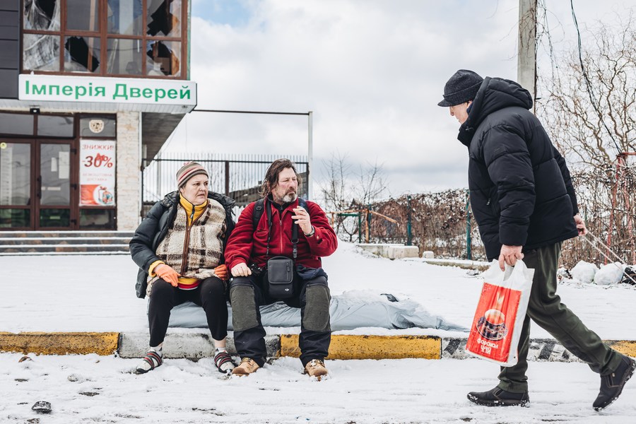 People rest by a road in Irpin, Ukraine, March 8, 2022. (Photo by Diego Herrera/Xinhua)