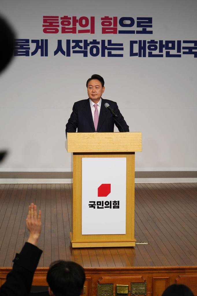 President-elect Yoon Suk-yeol speaks during a press conference at the National Assembly Library in Seoul, South Korea, March 10, 2022. Yoon Suk-yeol of the main conservative opposition People Power Party won a narrow victory in the South Korean presidential election amid people's aspiration for transfer of power. (Photo by James Lee/Xinhua)