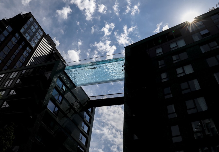 A person swims in the Sky Pool, a transparent swimming pool bridge across two residential blocks in south London, Britain, on June 2, 2021. (Xinhua/Han Yan)