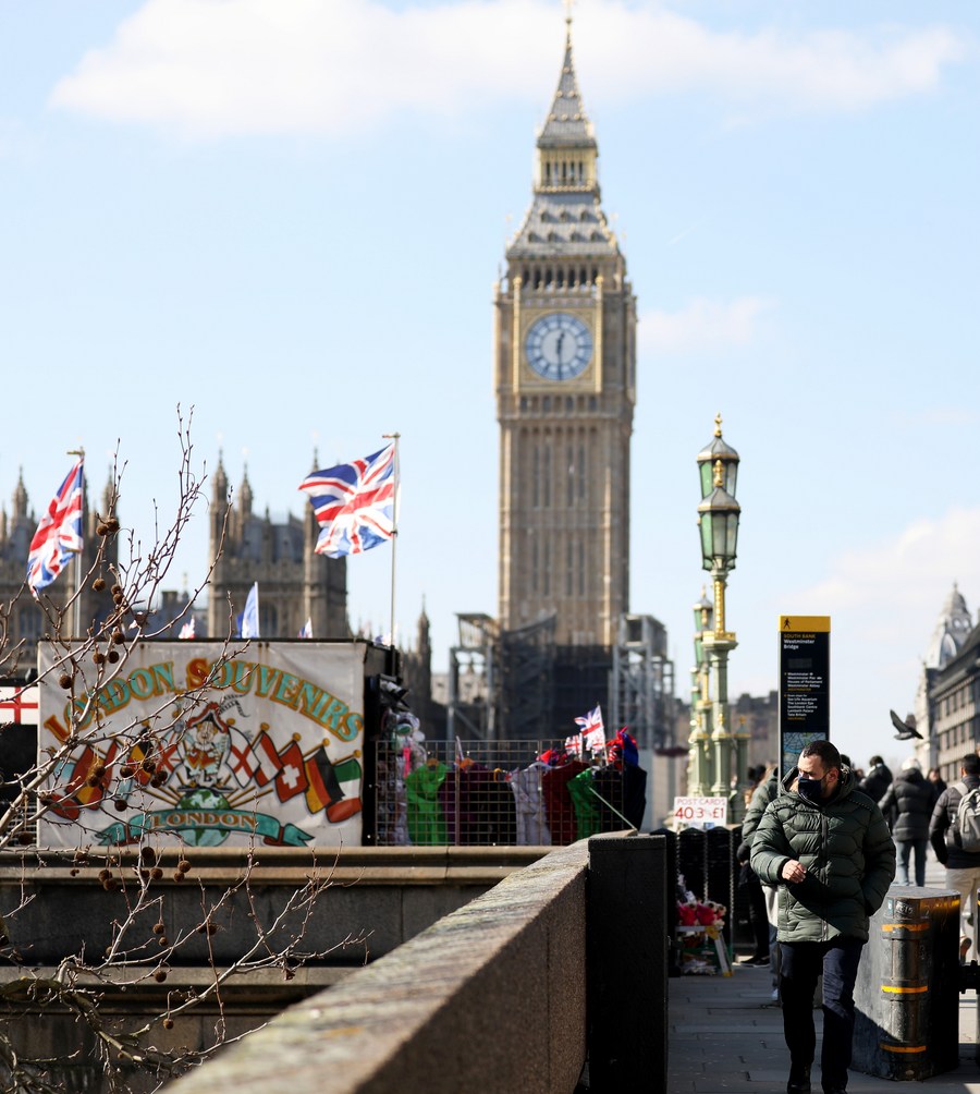 A man wearing a mask walks past Westminster Bridge in London, Britain, March 7, 2022. (Xinhua/Li Ying)