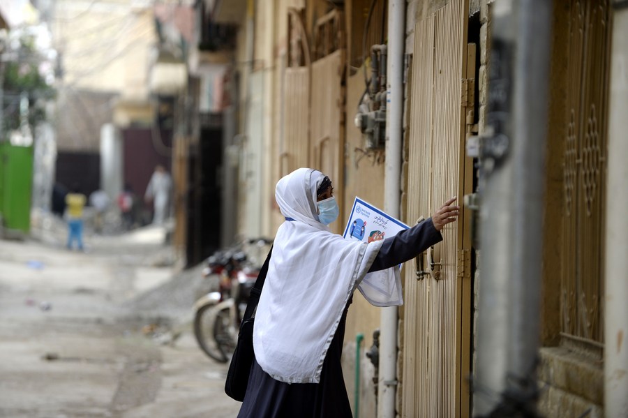 A female health worker rings a bell of a house during a door-to-door health service camping on the outskirts of Islamabad, capital of Pakistan, on March 8, 2022. (Xinhua/Ahmad Kamal)