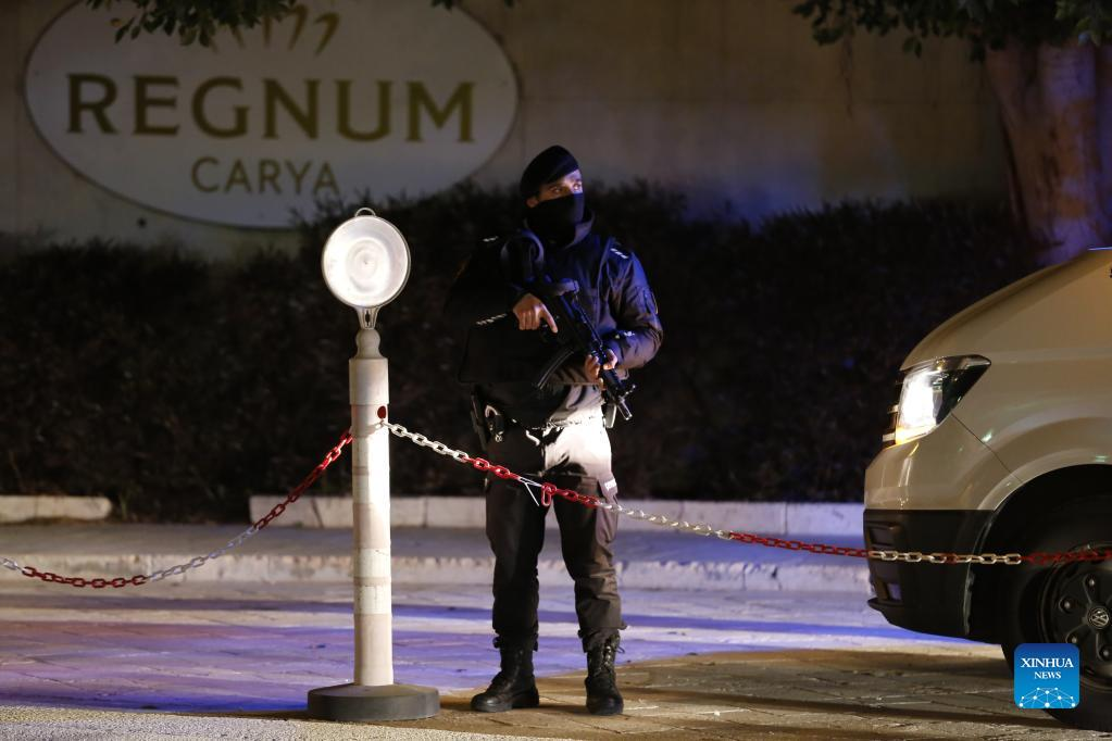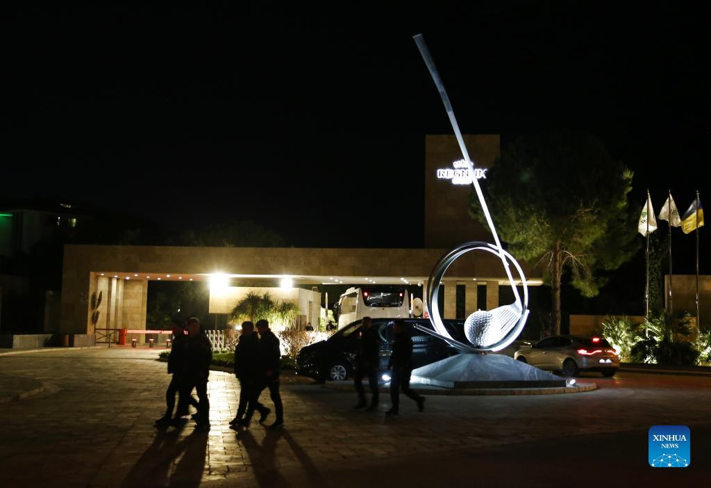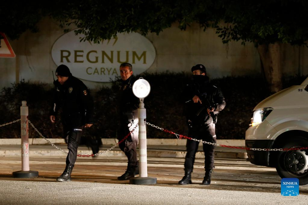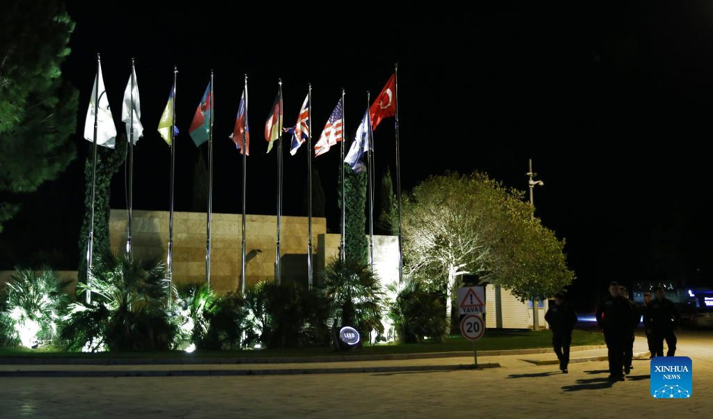 Security officers stand outside the hotel where Russian Foreign Minister Sergei Lavrov stays in Antalya, Turkey, March 9, 2022. Russian and Ukrainian foreign ministers are expected to meet in Turkey's southern province of Antalya Thursday on the sidelines of the Antalya Diplomatic Forum, according to Turkish Foreign Minister Mevlut Cavusoglu. (Xinhua/Li Zhenbei)