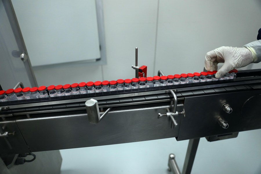 Photo taken on Sept. 6, 2021 shows COVID-19 vaccines on the production line of a factory of the Egyptian Holding Company for Biological Products and Vaccines (VACSERA) in Giza, Egypt. (Xinhua/Ahmed Gomaa)