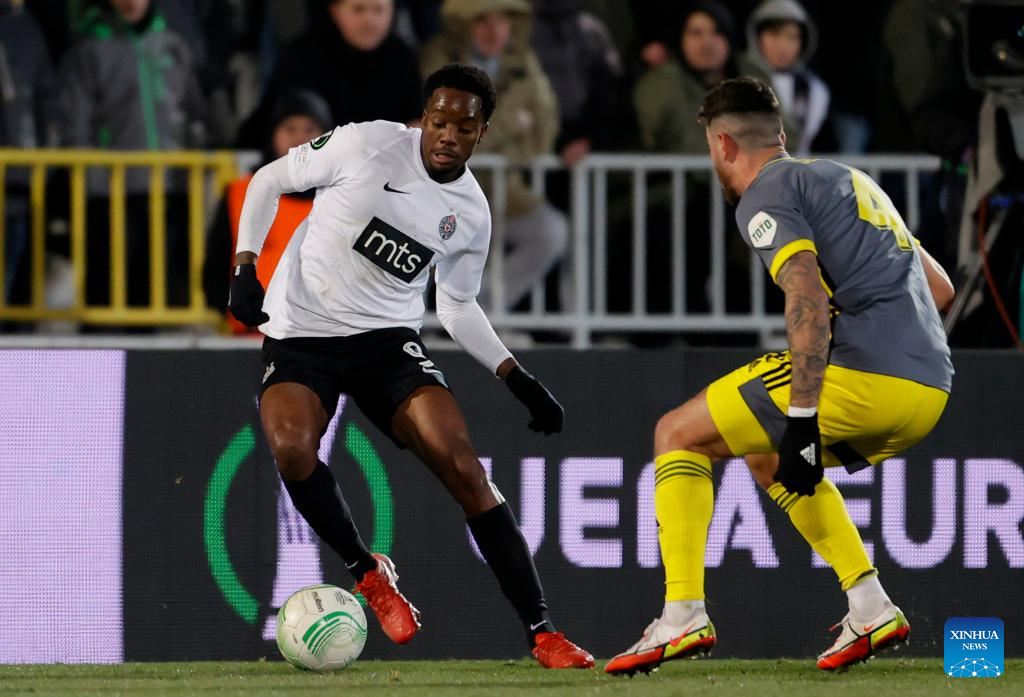 Partizan's Queensy Menig (L) vies with Feyenoord's Marcos Senesi during a UEFA Europa Conference League round of 16 first leg match between Partizan Belgrade and Feyenoord in Belgrade, Serbia, on March 10, 2022. (Photo by Predrag Milosavljevic/Xinhua)
