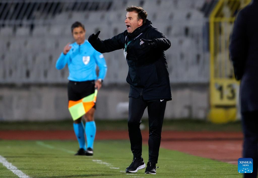 Partizan's head coach Aleksandar Stanojevic gestures during a UEFA Europa Conference League round of 16 first leg match between Partizan Belgrade and Feyenoord in Belgrade, Serbia, on March 10, 2022. (Photo by Predrag Milosavljevic/Xinhua)