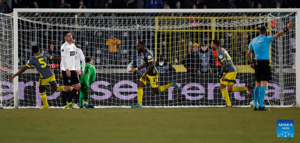 Feyenoord's players celebrate a goal during a UEFA Europa Conference League round of 16 first leg match between Partizan Belgrade and Feyenoord in Belgrade, Serbia, on March 10, 2022. (Photo by Predrag Milosavljevic/Xinhua)