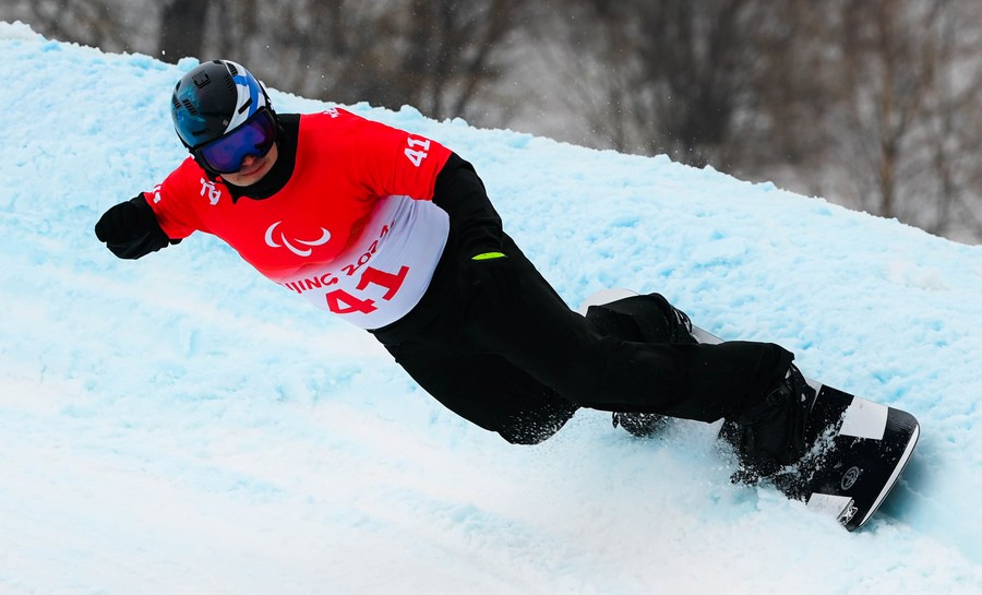 Sun Qi of China competes in the Para snowboard men's banked slalom SB-LL2 event of Beijing 2022 Paralympic Winter Games. (Xinhua/Yan Linyun)