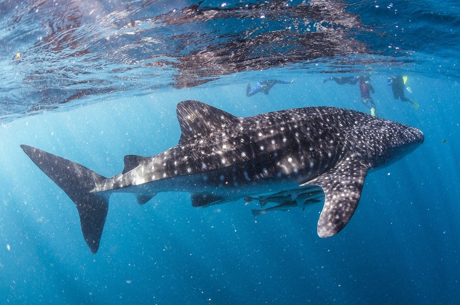 Photo taken on July 11, 2016 shows divers watching a whale shark near Ningaroo Reef in Western Australia. (Xinhua/Nathan Lin)