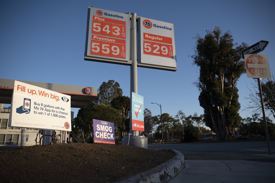 Photo taken on March 6, 2022 shows a gas station in Millbrae, California, the United States. (Photo by Li Jianguo/Xinhua)