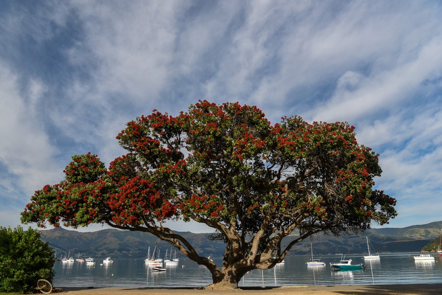 A Pohutukawa tree is seen at the port in Akaroa, New Zealand, Jan. 11, 2022. (Xinhua/Guo Lei)
