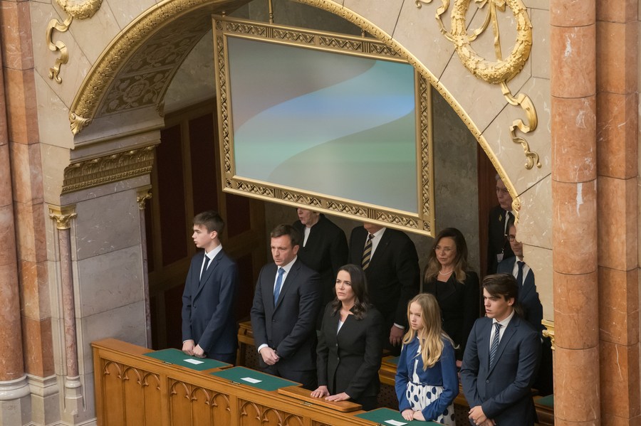 Katalin Novak (C) is seen with her family after taking oath in Hungarian Parliament, Budapest, Hungary, March 10, 2022. (Photo by Attila Volgyi/Xinhua)