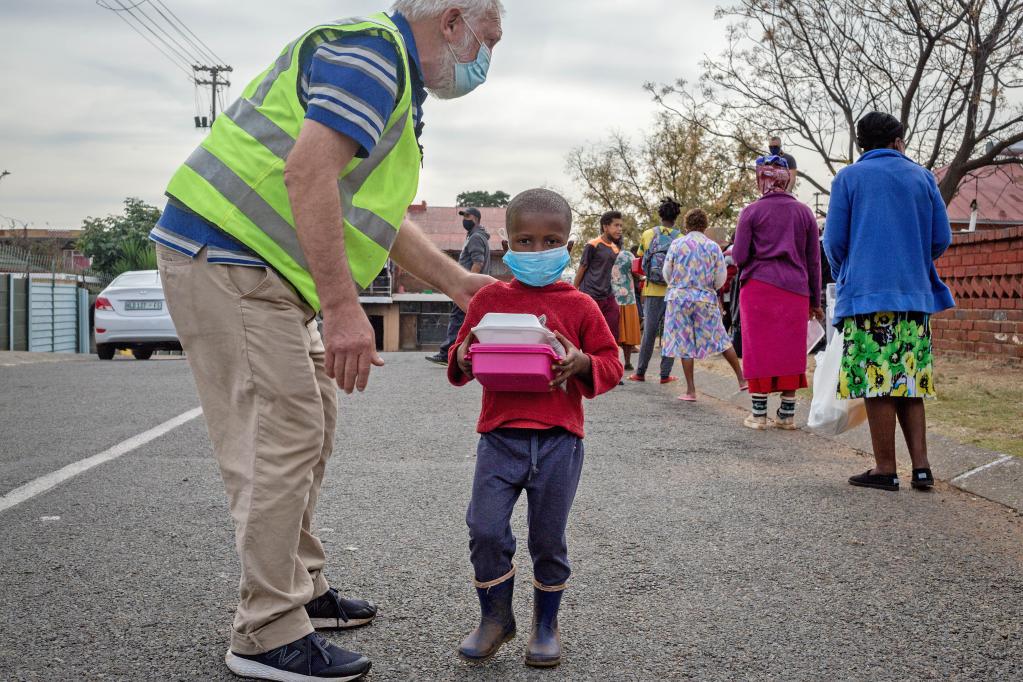 A child wearing a face mask gets community free food in Johannesburg, South Africa, May 19, 2020. (Xinhua/Yeshiel)