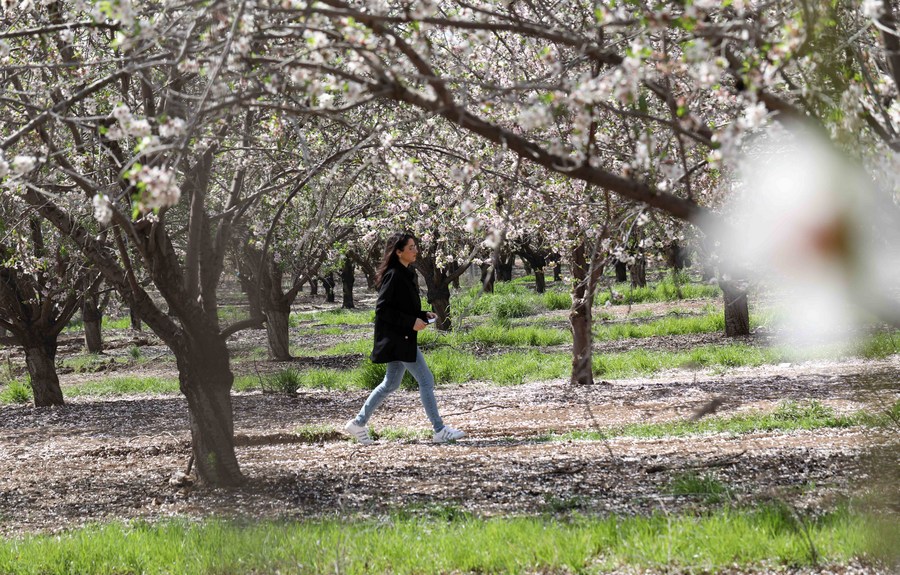 A woman walks among almond trees in blossom near central Israeli city of Modiin, on March 7, 2022. (Photo by Gil Cohen Magen/Xinhua)