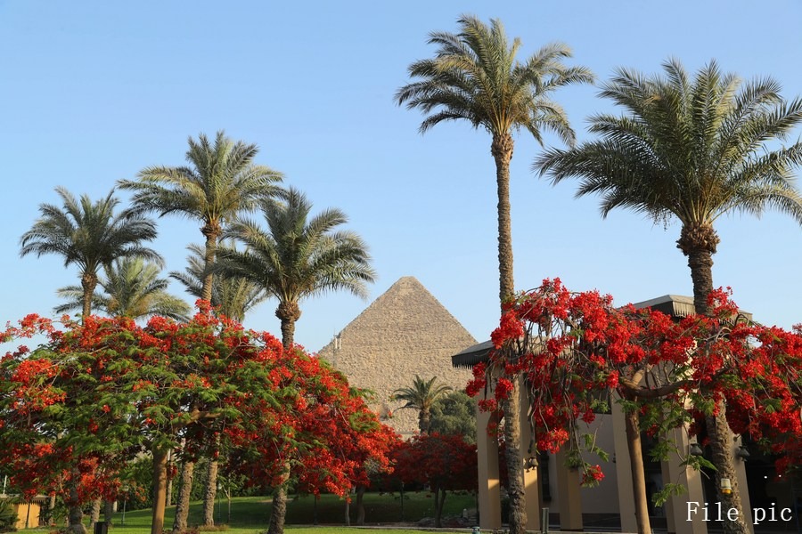 Photo taken on May 29, 2021 shows flowering royal poinciana trees with the Great Pyramid in the distance in Cairo, Egypt. (Xinhua/Sui Xiankai)