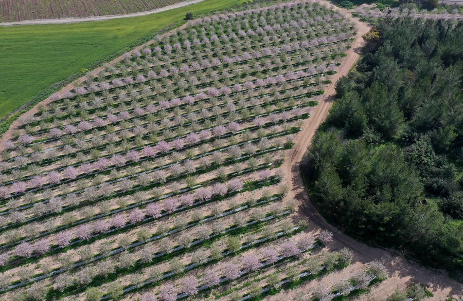 Aerial photo taken on March 7, 2022 shows almond trees in blossom near central Israeli city of Modiin. (Photo by Gil Cohen Magen/Xinhua)