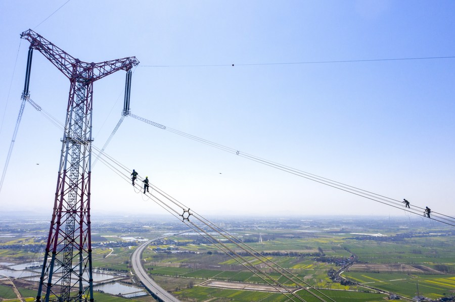 Aerial photo taken on March 10, 2022 shows electricians working on the Lingzhou-Shaoxing 800-kilovolt direct current transmission line over the Yangtze River in Chizhou, east China's Anhui Province. At a height of up to 280 meters over the Yangtze River in Chizhou, east China's Anhui Province, a team of utility technicians recently carried out an overhaul for the Lingzhou-Shaoxing 800-kilovolt direct current transmission line. The ultra-high-voltage (UHV) power transmission project stretching from Lingzhou of northwest China's Ningxia Hui Autonomous Region all the way to Shaoxing of east China's Zhejiang Province, is an important part of the country's massive power network often termed "power highways," built to transmit electricity from its resources-rich west to the more developed, power-thirsty east. (Xinhua/Liu Junxi)